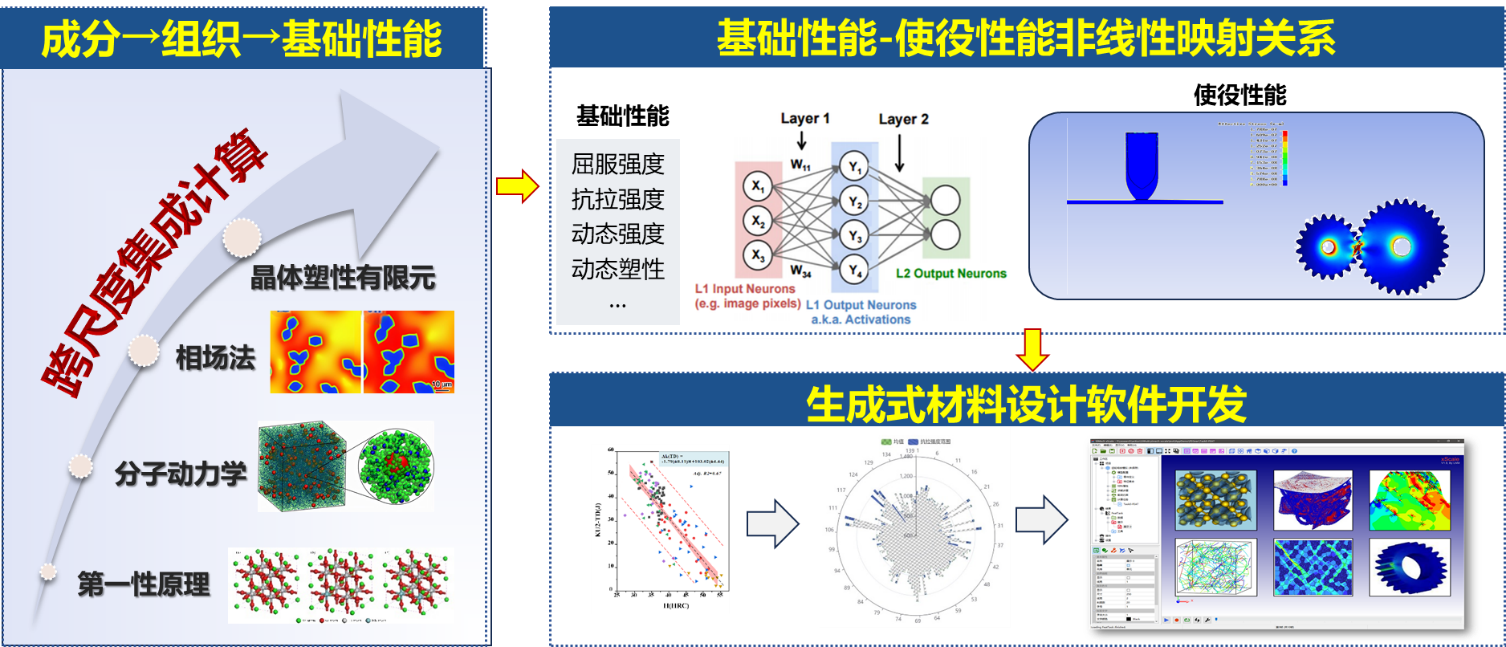 开发具有自主知识产权的通用型材料设计国产软件,占据材料CAE软件技术制高点。建立微-介-宏观跨尺度集成计算方法,实现基于成分及组织的基础性能预测;揭示从材料基础性能到使役性能的非线性映射关系,开发生成式材料设计软件。