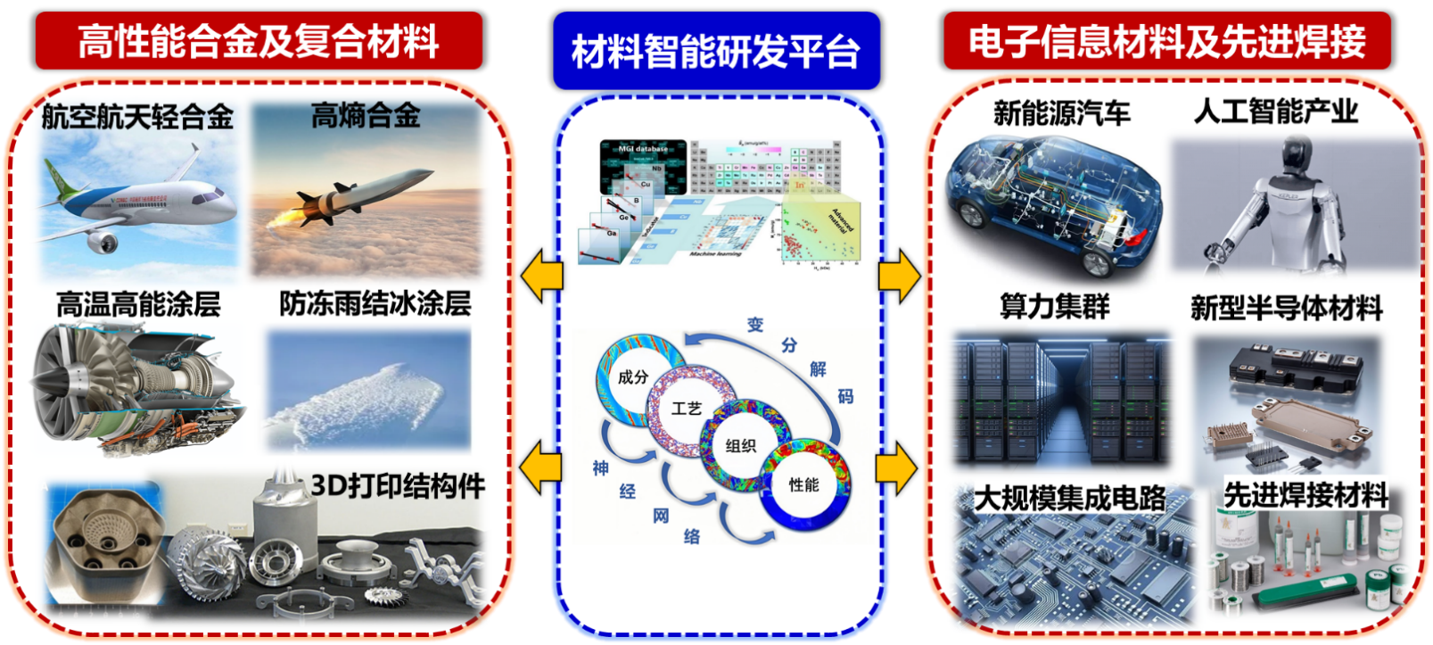 基于集成计算软件、高通量制备与表征、材料大模型等技术,构建材料智能研发平台;在此基础上,开展航空航天轻合金、高熵合金、高温高能涂层、防冻雨结冰涂层等高性能合金及复合材料研究,发展电子信息材料及先进焊接技术,推动我国新材料跨代发展。